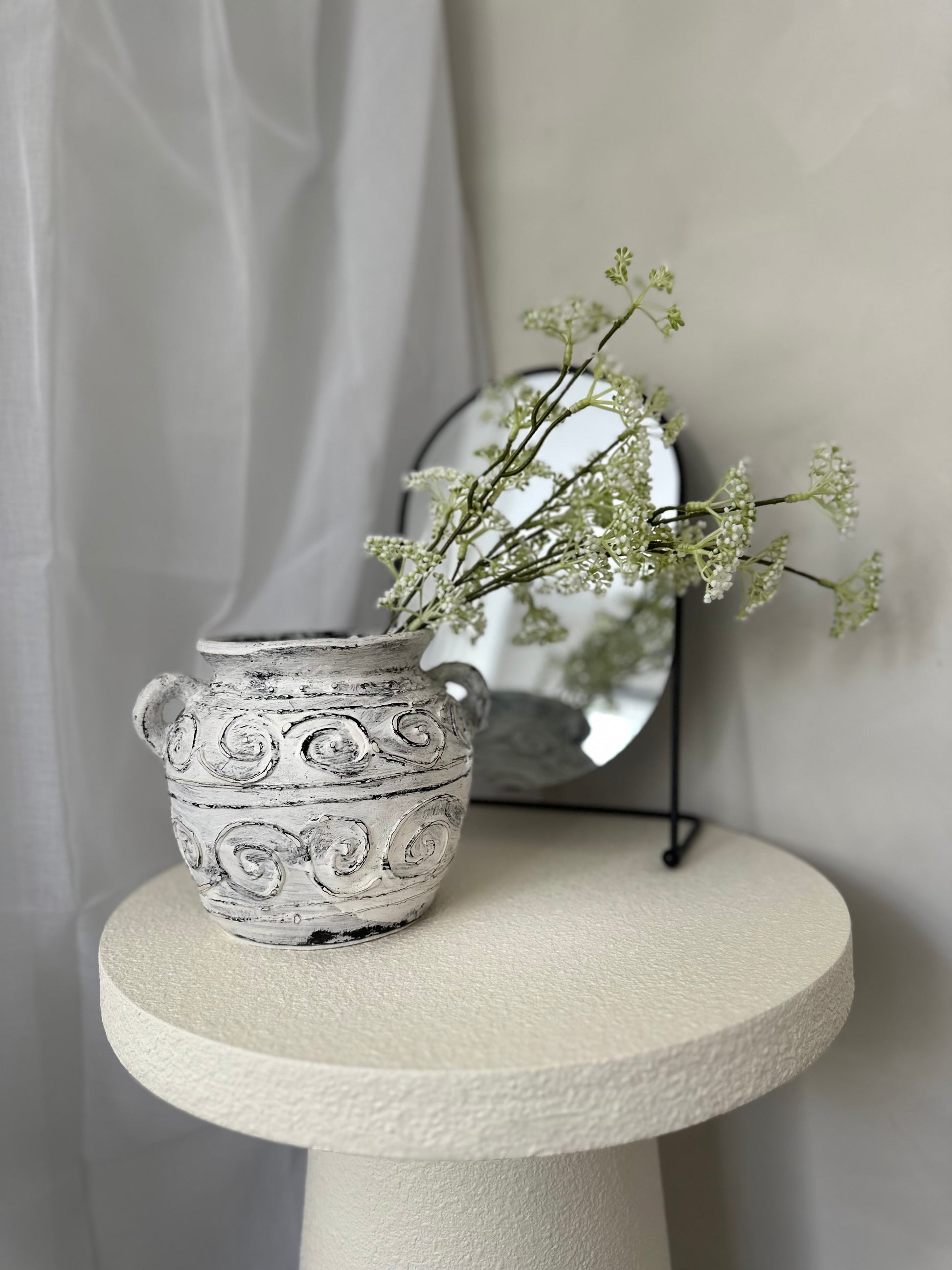 The Sari vase is aesthetically pleasing with its unique patterns, colour and handles. It will fit perfectly as a statement or with stems and flowers.